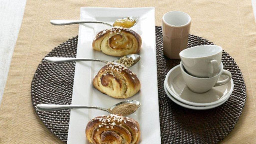 Anna puustien kohota lämpimässä paikassa kaksinkertaisiksi. Voitele munalla ja ripottele päälle raesokeria. Paista 200-asteisen uunin keskitasolla kauniin värisiksi, noin 10 minuuttia.