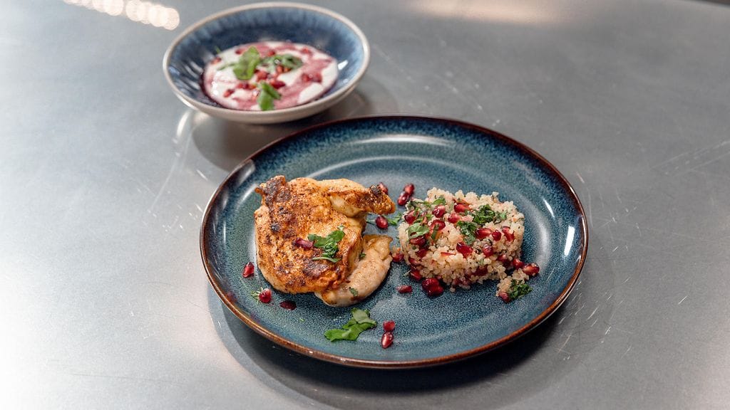 YRTTINEN QUINOA: Keitä quinoa pakkauksen ohjeen mukaan. Purista sekaan 2 rkl sitruunan mehua, lisää granaattiomenan siemenet. Lisää joukkoon pieneksi pilkottuja yrttejä maun mukaan. Siivuta chiliä päälle. Maista ja lisää mausteita maun mukaan.
