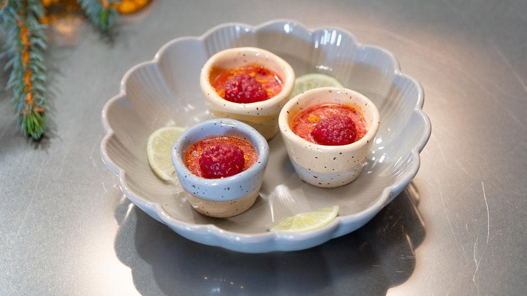 Anna jäähtyä jääkaapissa mielellään yön yli. Ennen tarjoilua ripottele piparin murusia pinnalle ja laita vadelmat ja siirappiseosta antamaan makua. Vielä muutama tippa limeä päälle ja voilà.