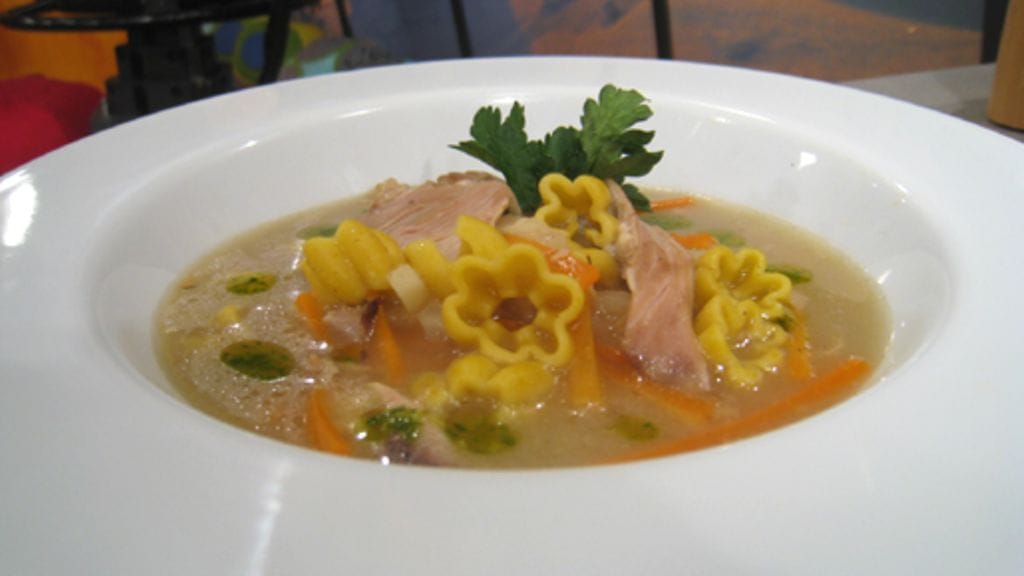 Kuumenna liemi uudelleen kiehuvaksi ja lisää sinne suikaloidut porkkanat ja selleri sekä pastat. Kun ne ovat kypsiä, suurusta keittoa hiukan tärkkelysjauhoilla.