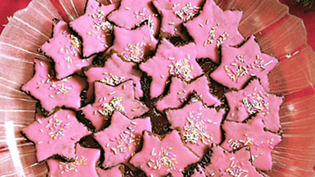 4. Sekoita tomusokeri ja valkuainen paksuksi tahnaksi, värjää se vaaleanpunaiseksi ja penslaa pikkuleivät kuorrutuksella. Ripottele päälle strösseliä.