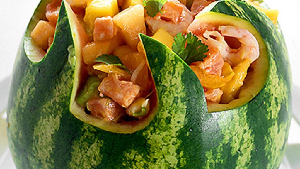 3. Sekoita meloni ja kurkku katkarapuseokseen ja täytä seoksella meloninkuori. Koristele tuoreella korianterilla.