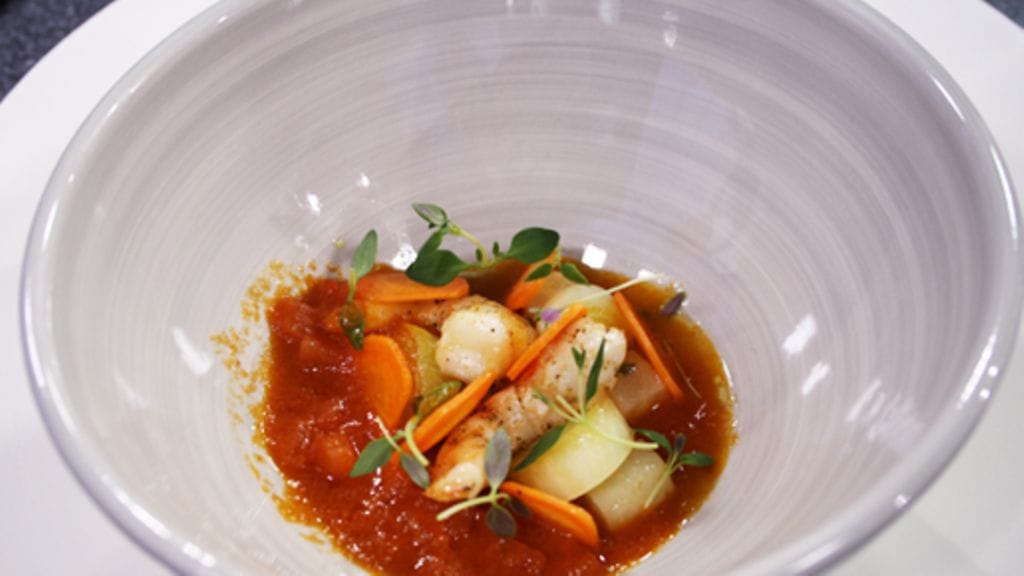 1. Kuori meriravut ja sipulit. Laita pilkotut sipulit kattilaan ja kuullota. Laita ravun kuoret, pilkottu porkkana ja tomaatit kattilaan. Lisää mausteet ja viini. Lisää tilkkaa vettä niin, että ainekset peittyvät. Keitä noin 20 minuuttia ja siivilöi. Tarkista maku ja keitä noin 1/3 osa kasaan.