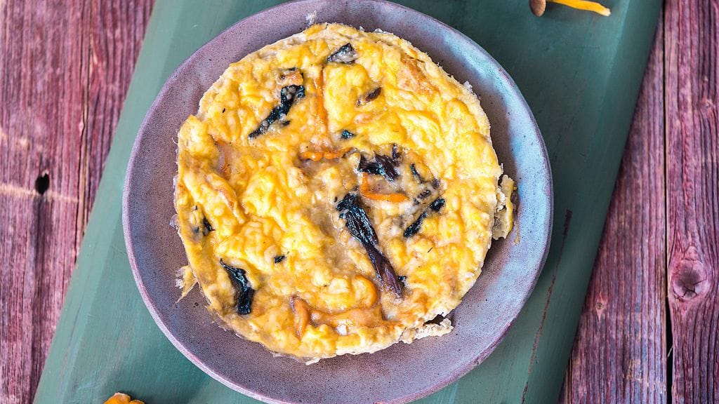 Kuumenna öljy pannulla ja kääntele sieniä kuumalla pannulla hetki. Sekoita munat, suola, vesi tai kerma ja juustoraaste keskenään.