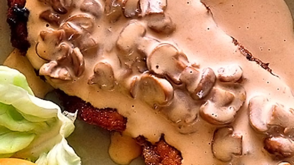 4. Paista leikkeet kypsiksi voissa, kaada päälle sienimuhennos ja tarjoile.