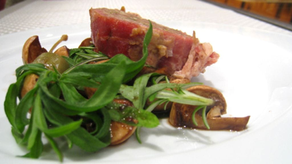 Kiedo pekoniviipaleet murekkeen ympärille ja paista pitkulaisesa vuoassa kypsäksi 180-asteisessa uunissa noin kolme varttia. Jäähdytä ja tarjoa viipaloituna esimerkiksi marinoitujen sienten kanssa.