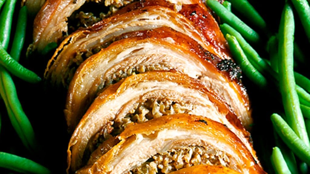 2. Sekoita murekkeen ainekset ja levitä se lihapuolelle. Kääri tiukalle rullalle ja sido paistinlangalla.