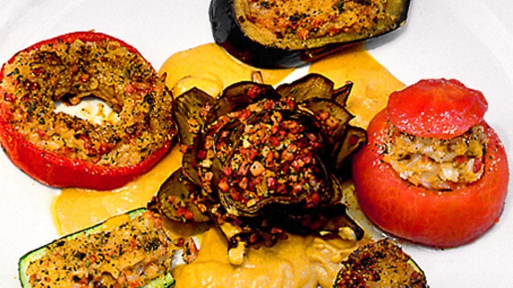 1. Kuumenna uuni 200 asteeseen. Leikkaa jokaisesta tomaatista ”hattu” pois. Paloittele kesäkurpitsa neljäksi ”tukiksi”. Kuori hopeasipulit. Ryöppää kesäkurpitsaa ja sipuleita 5 minuuttia kiehuvassa vedessä. Voitele uuninkestävä vuoka. Hienonna persilja.