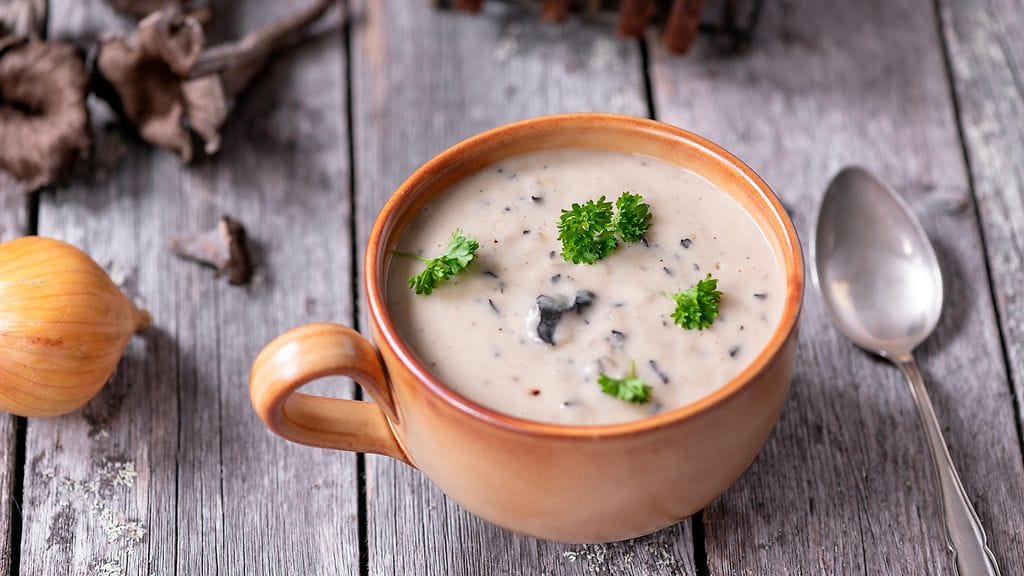 Lisää mustatorvisienet ja hienonnettu sipuli ja valkosipulinkynsi. Kääntele, kunnes sienet ovat pehmenneet. Lisää joukkoon vehnäjauhot ja kääntele. Lisää vesi, kasvisliemikuutio ja mustapippuria myllystä. Lisää lopuksi sulatejuusto tai tuorejuusto ja anna keiton kiehua hiljalleen noin viisi minuuttia usein hämmentäen. Tarkista maku. Lisää tarvittaessa suolaa.
