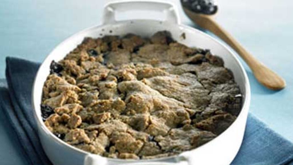 Sulata voi, lisää sokeri ja ruisjauho-soodaseos ja sekoita taikinaksi. Levitä vähän yli puolet taikinasta keskikokoisen uunivuoan pohjalle, kaada mustikat siihen ja ripottele niille sokeri ja suuruste.