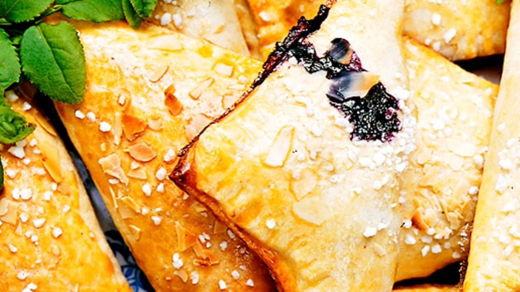 2. Kaulitse taikina kevyesti jauhotetulla alustalla. Leikkaa levy neliöiksi, penslaa reunat kananmunalla. Laita neliöille mustikoita ja hunajaa. Kääntele yhteen kolmioiksi ja painele reunat yhteen.