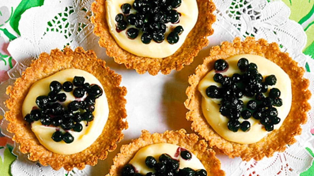 2. Kuumenna uuni 200 asteeseen. Painele taikina pieniin vuokiin. Paista ne kypsiksi uunissa n. 15 minuuttia.