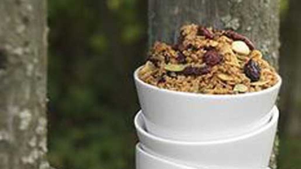 Sekoita suuressa kulhossa kaurahiutaleet, pekaanipähkinät, mantelit, rusinat, kuivatut karpalot ja auringonkukansiemenet. Sekoita toisessa kulhossa sokeri, vaahterasiirappi, kaneli, kardemumma, vaniljaesanssi tai -sokeri ja öljy.