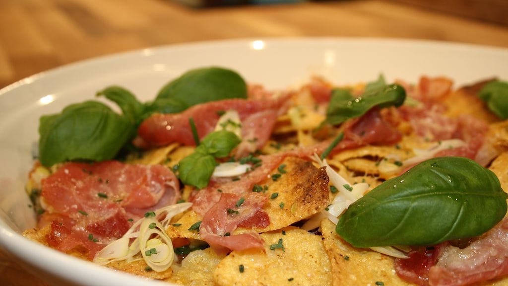 Lisää vielä ilmakuivattu kinkku sekä Manchego-juustoraaste viimeiseksi. Paahda uunin grilli-vastuksilla kunnes juusto on sulanut ja kinkku pinnalla on rapeaa. Tarjoile heti.