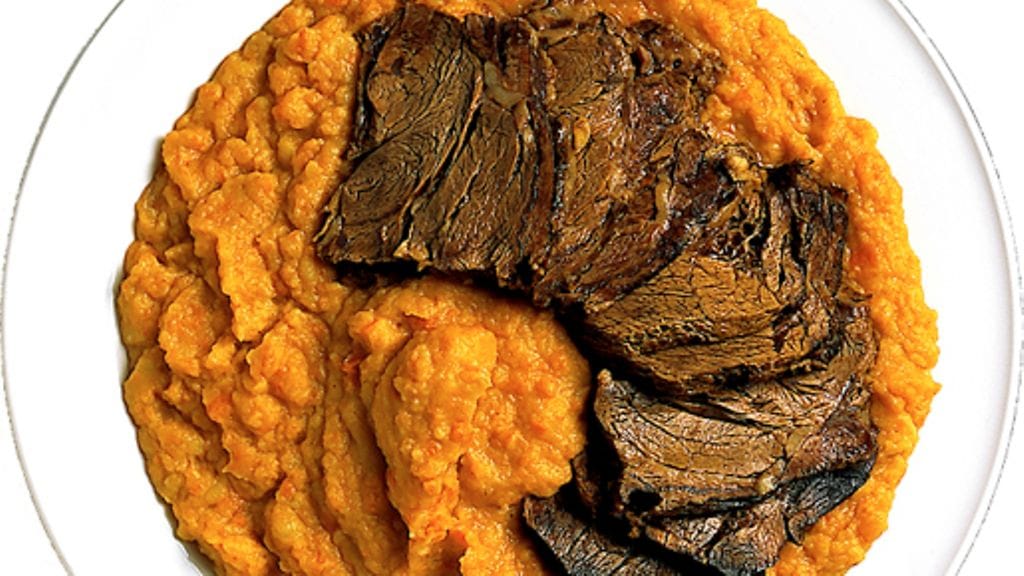 3. Nosta liha pois padasta ja leikkaa se viipaleiksi. Pidä viipaleet lämpimänä. Ota talteen pieni määrä keitinlientä. Soseuta vihannekset perunanuijalla.