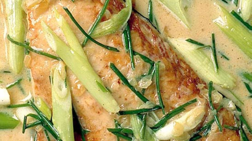 2. Tee kastike: Ruskista sipuli kevyesti voissa. Kaada päälle viini, lisää heravoi ja anna kastikkeen kiehua kokoon hieman. Lisää kerma ja maito, anna kastikkeen jälleen kiehua kokoon. Mausta suolalla ja vastajauhetulla valkopippurilla. Lisää paljon ruohosipulia juuri ennen tarjoilua.