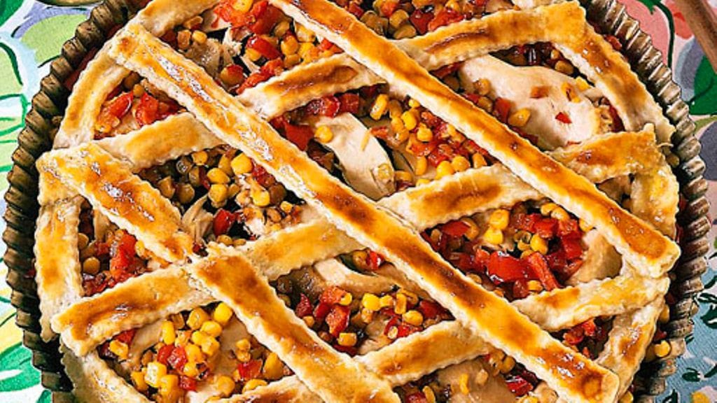 3. Sekoita täytteen ainekset ja laita piiraskuoreen. Leikkaa taikinapyörällä lopputaikinasta nauhoja ja tee niistä ristikko piiraan päälle. Penslaa ristikko vatkatulla munalla ja paista piiras kypsäksi noin 20 minuuttia.