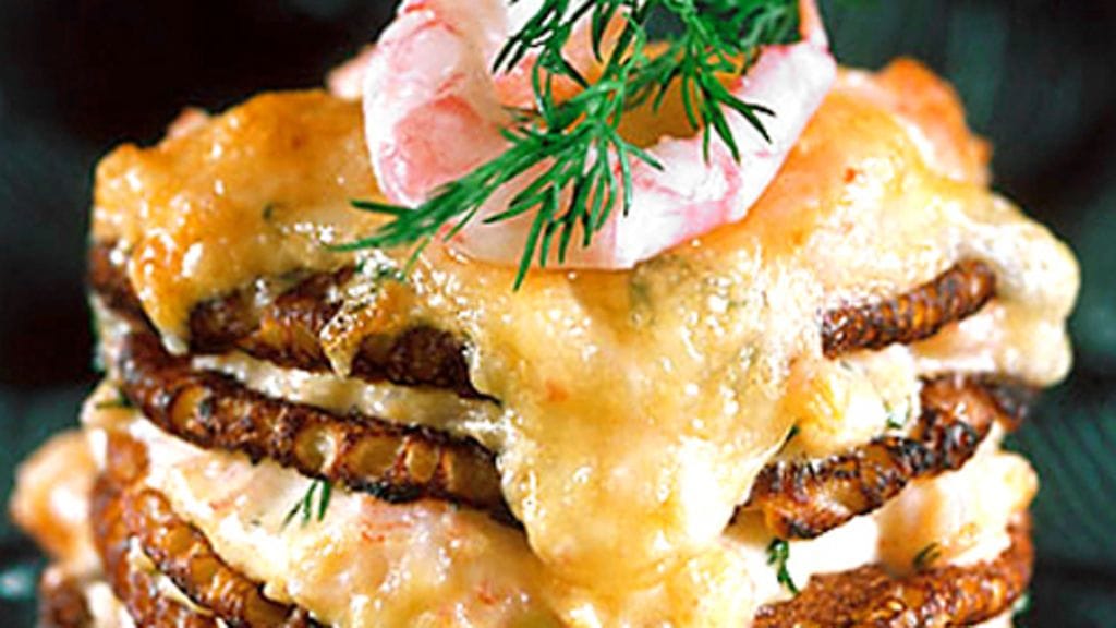 6. Gratinoi uunissa juuri ennen tarjoilua niin että juusto sulaa. Koristele katkaravulla ja tillillä.