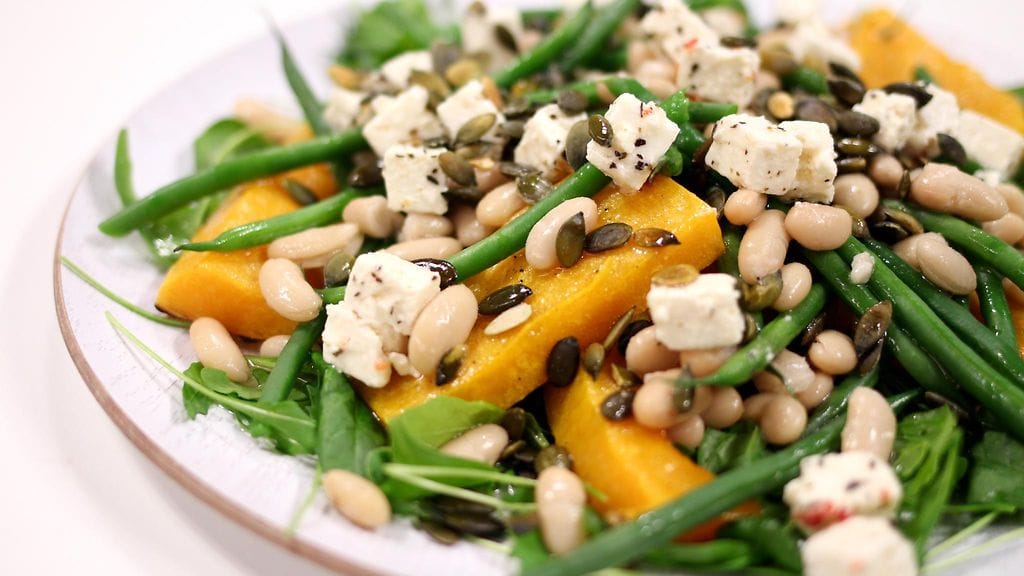 Sekoita hiukan jäähtyneet kurpitsalohkot, vihreät pavut, valkopavut, pinaatti ja rucola. Ota ½ dl fetan öljyä talteen ja purista mukaan ½ sitruunan mehu. Sekoita kastike salaatin joukkoon. Ripottele pinnalle feta ja kurpitsansiemenet.