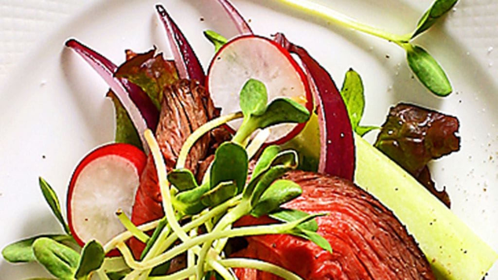 2. Kuori kurkku ja leikkaa se tangoiksi, suikaloi tomaatti ja punasipuli. Asettele vihannekset kauniisti lautasille tai vadille yhdessä paahtopaistin ja retiisien kera. Koristele krassilla. Tarjoile yrttikastikkeen kera.