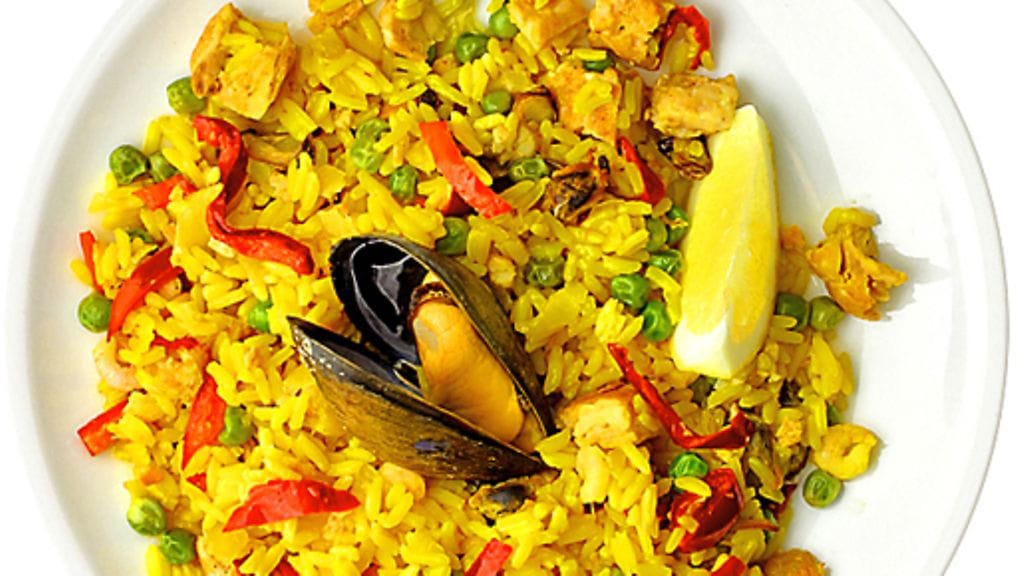2. Paloittele kananpoika pienemmiksi paloiksi. Kuutioi sianlapa. Kuumenna hieman öljyä paella- tai paistinpannussa. Ruskista kana ja porsaskuutiot. Nosta pannusta. Hienonna keltasipuli ja valkosipulinkynnet. Poista paprikasta siemenet ja suikaloi paprikat. Kaada loput öljystä pannuun. Paista sipuli ja valkosipuli kullankeltaisiksi. Lisää paprika ja riisi. Paista muutama minuutti samalla sekoittaen.