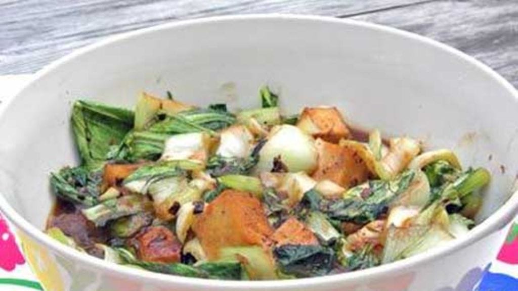 Kuumenna pähkinäöljy kuumaksi wokissa tai korkeareunaisessa pannussa ja lisää marinoitu tofu sekä inkivääri. Hellan tulee olla täysillä, joten paistettavia aineksia tulee vahtia ja sekoitella koko ajan kuumassa öljyssä. Paistele tofua vajaan minuutin verran ja lisää joukkoon paksoin lehtien valkoinen osa (tai kaikki kiinankaali) ja reilun kymmenen sekunnin paistelun jälkeen vihreä lehtiosa sekä kastike. Käännä lämmöt jo pois, mutta jatka sekoittamista pohjalta asti. Maissitärkkelys antaa kastikkeelle kiiltoa ja hieman suurustaa lientä. Maista soijan määrä ja lisää tarvittaessa, mustapaputahnassa on kuitenkin itsessään hyvin paljon suolaa, joten tämä ei ole välttämättä tarpeellista.