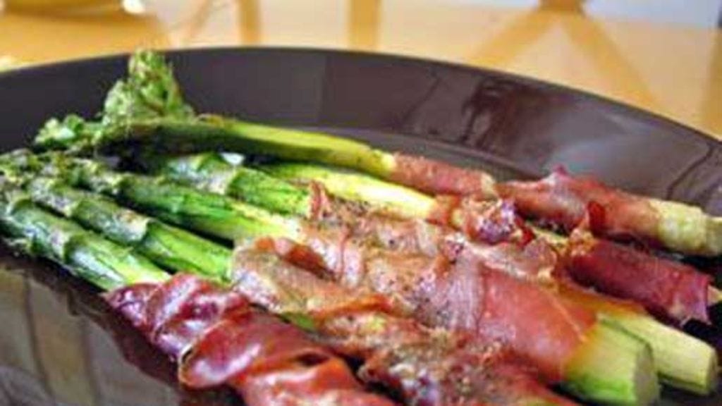 Kääri kinkkuviipale kunkin parsan ympärille. Aseta käärityt parsat uunivuokaan ja sivele lopulla öljyllä. Mausta pippurilla.