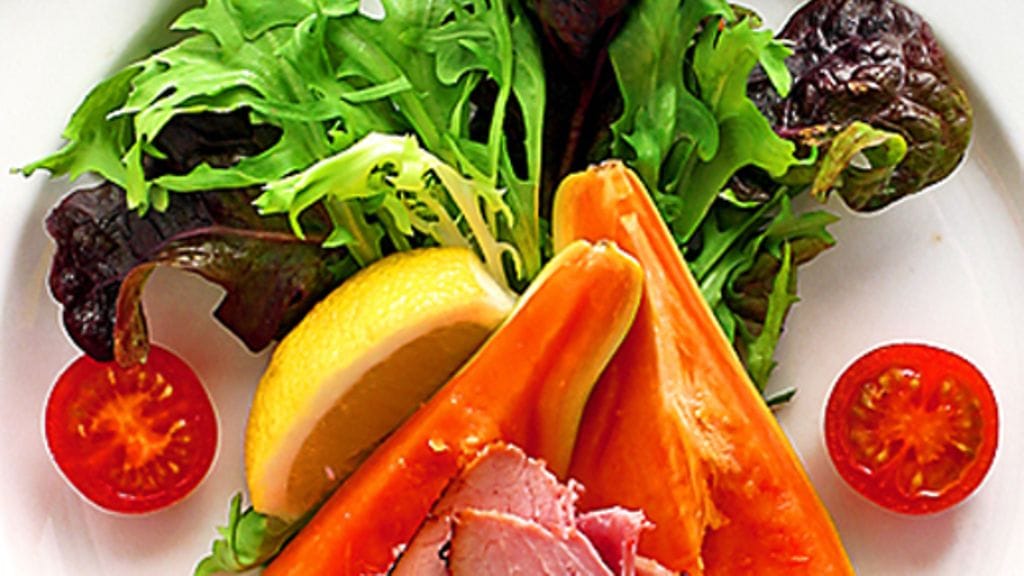 1. Paloittele papaija. Asettele salaatti vadille papaijan ja kinkun kera. Puolita tomaatit ja asettele vadille. Koristele sitruunalla.