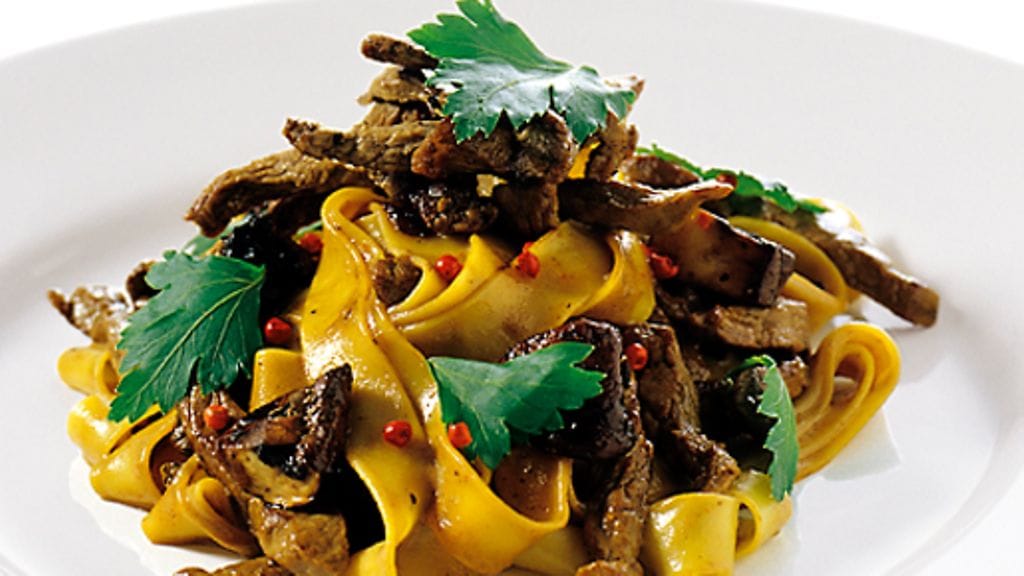 3. Suikaloi liha. Sulata pannulla loput voista ja ruskista suikaleet nopeasti. Lisää suikaleet kastikkeeseen. Sekoita joukkoon vastakeitetty pasta ja tarjoile heti.