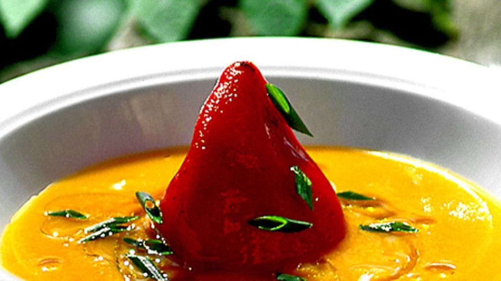 2. Kuumenna uuni 275 asteeseen. Puolita paprikat ja poista siemenet. Laita ne uunipellille kupera puoli ylöspäin. Laita valkosipulinkynnet samalle pellille ja paahda kaikkia 10 minuuttia uunissa. Nosta paprikat kulhoon ja peitä tuorekelmulla. Anna valkosipulinkynsien jäähtyä. Kuori ja silppua sipuli ja kuullota sitä öljyssä kattilassa, kaada päälle vihannesliemi ja lisää kuutioidut perunat. Mausta rosmariinilla ja tomaattipyreellä. Keitä 10 minuuttia.