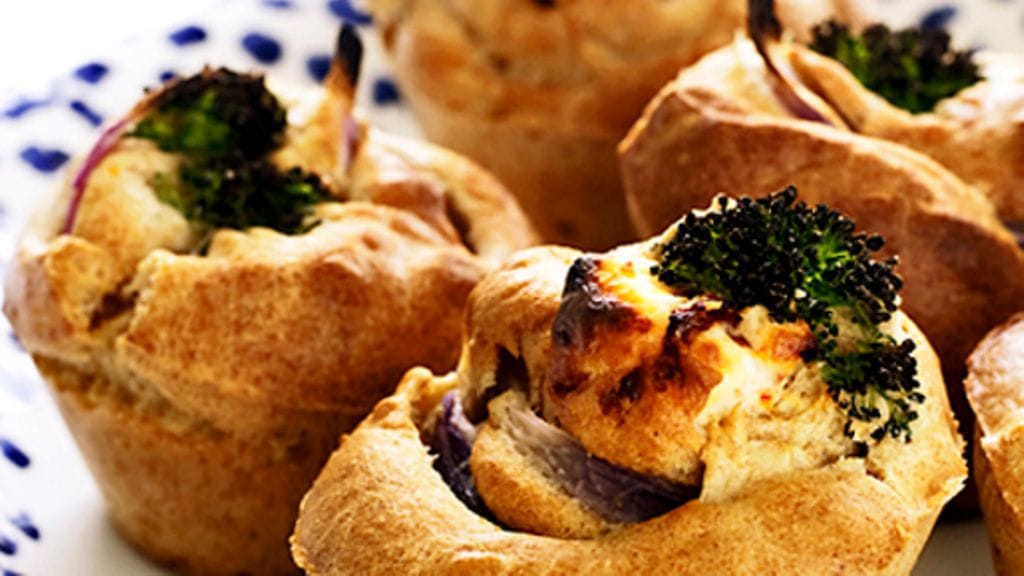 1. Kuumenna uuni 175 asteeseen. Voitele ja jauhota 12 muffinivuokaa. Keitä kattilassa vähäsuolaista vettä ja ryöppää parsakaalinnuppuja siinä puoli minuuttia. Kaada lävikköön ja huuhtele nuput jääkylmällä vedellä. Keitä 3 dl vettä toisessa kattilassa. Leikkaa sipuli lohkoiksi ja laita ne kulhoon. Kaada kiehuva vesi lohkojen päälle, seisota minuutti, siivilöi ja anna jäähtyä.