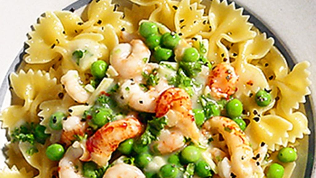 3.. Nosta pastaa lämpimille lautasille. Sekoita keskenään herneet, katkaravut ja ravunpyrstöt ja jaa pastan päälle. Jauha päälle mustapippuria ja tarjoa parmesaaniraastetta ohessa.