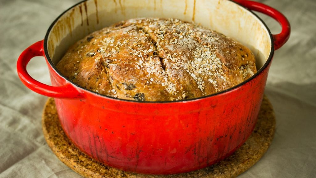 Ota puolen tunnin päästä pata uunista, nosta leipä käsin tai leivinpaperin avulla varovasti tulikuumaan pataan (jos käytät leivinpaperia, se saa jäädä pataan). Vedä leivän pinnalle muutama koristeviilto terävällä veitsellä ja ripottele päälle vähän leseitä. Pane uunin kestävä kansi padan päälle ja nosta pata leipineen uuniin alimmalle ritilätasolle kypsymään 30 minuutiksi. Ota sen jälkeen kansi pois ja jatka paistamista vielä 15 min.Ota pata uunista ja nosta leipä pois varoen kuumaa pataa. Voit säilyttää leipää pinnoitetussa padassa.Resepti: Arja Elina Laine, Myllyn Paras Oy