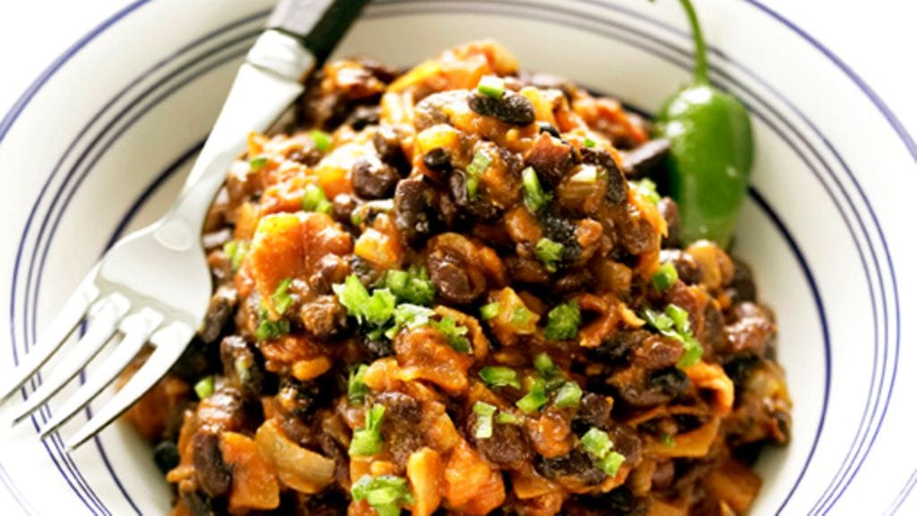 2. Kääntele joukkoon pavut, black bean -kastike, ananasmehu ja tomaattimehu. Keitä hiljaa 15 minuuttia. Silppua jalapeno hienoksi, lisää sitä ruokaan maun mukaan, mausta vielä suolalla, jos tarpeen.