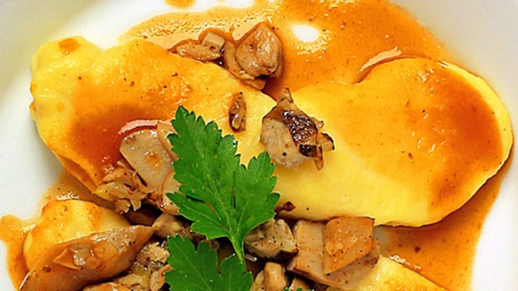 3. Kumoa taikina jauhotetulle pöydälle ja kierittele se pitkäksi nauhaksi, jonka halkaisija on n. 1 ½ cm. Leikkaa pieniksi paloiksi ja kierittele palat munanmuotoisiksi paloiksi. Kuumenna kevyesti suolattua vettä kiehuvaksi ja anna gnocchien kiehahtaa hiljaa n. 2 minuuttia kunnes ne nousevat pintaan. Nosta gnocchit vedestä reikäkauhalla, laita siivilään ja kasta nopeasti kylmään veteen. Keitä kasvisliemi, lisää voi ja oliiviöljy. Lämmitä gnocchit liemessä ennen tarjoilua. Tarjoile sienten kera.