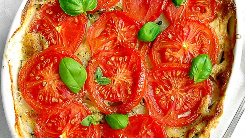 5. Peitä gratiini tomaattiviipalein 15 minuutin paistamisen jälkeen.