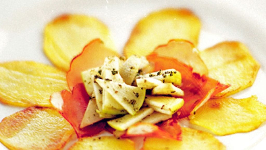 3. Jaa lämmitetyille lautasille perunaviipaleet kukan terälehtien muotoon. Asettele kinkku keskelle ja lusikoi päälle omenasalaatti. Tarjoile heti.
