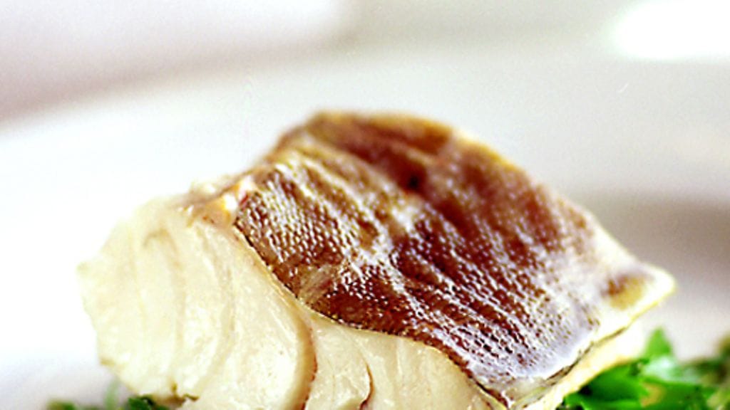 3. Keitä kalaa miedolla lämmöllä 4-6 minuuttia, tai kunnes se on valkoista myös sisältä. Peitä tarjoiluvati persiljasilpulla ja nosta keitetty kala persiljapedille. Kaada persiljakastike päälle. Tarjoile perunalastuja lisäkkeenä.