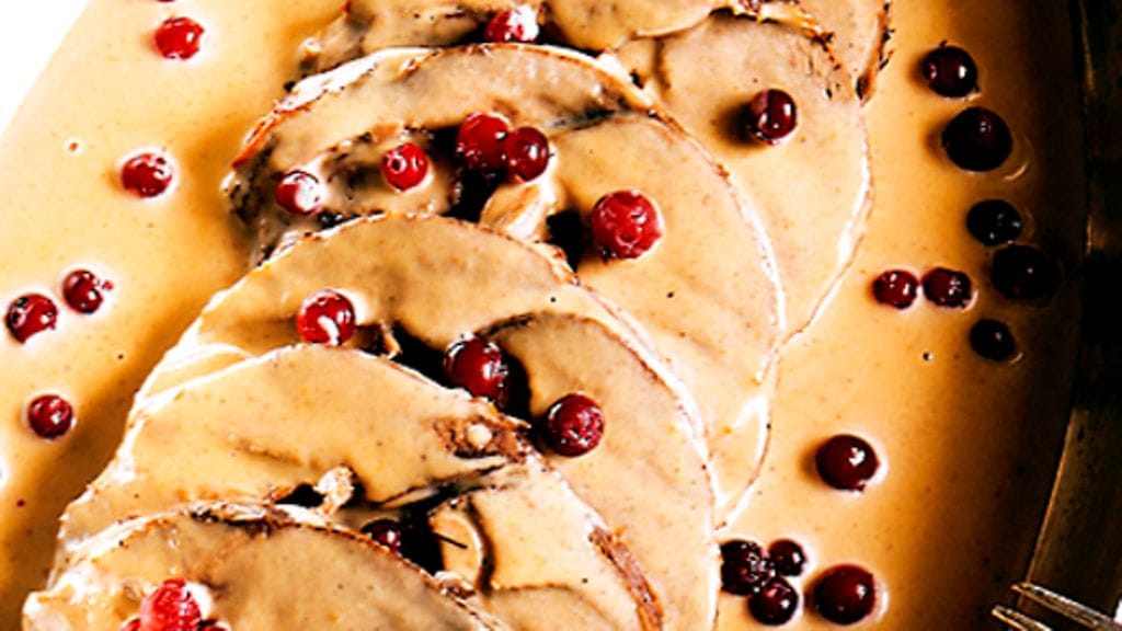 3. Siivilöi paistoliemi ja lisää siihen loput lihaliemestä. Keitä kokoon kerman kanssa puoleen alkumäärästä. Mausta kastike calvadosilla ja herajuustolla. Viipaloi paisti, kaada kastike päälle ja koristele puolukoilla tai karpaloilla.
