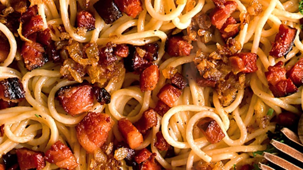3. Vatkaa munat, sekoita juustoraasteen ja muskotin (ripaus) kanssa. Sekoita munaseos nopeasti pastaan ja lisää pekonit ja sipuli. Ripottele päälle persiljaa. Tarjoile.
