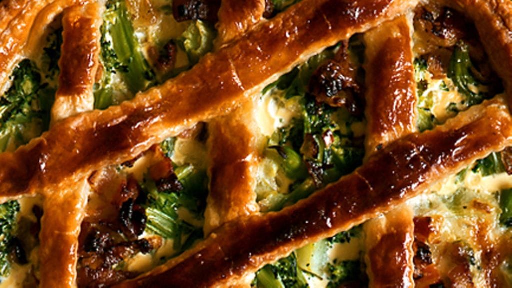 3. Kaulitse taikina ja vuoraa sillä piirakkavuoka. Säästä hieman taikinaa koristeluun. Painele taikina reunoille ja pistele pohja haarukalla. Lisää vuokaan parsakaali ja sipuli-pekonipaistos. Vatkaa munat, kerma ja juustoraaste, mausta kevyesti. Kaada seos piirakkaan. Ota taikinasta taikinapyörällä kaistaleita ja asettele ne piirakalle. Penslaa vatkatulla munalla, paista uunissa n. 30 minuuttia.