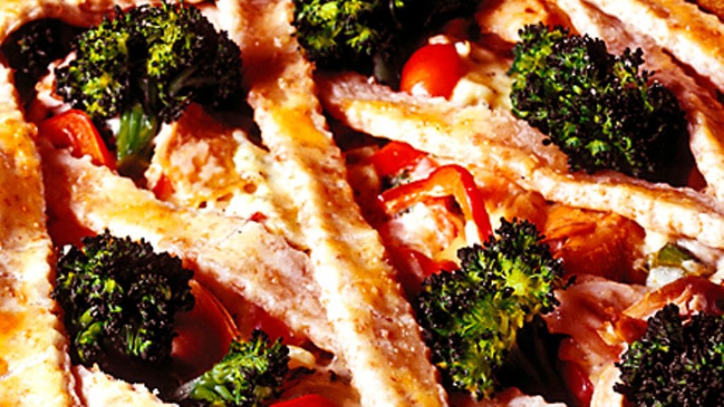 7. Kaulitse ylijäämätaikina, ota siitä suikaleita ja laita piiraan päälle. Pistele ruutujen väliin hieman parsakaalia ja paprikaa.