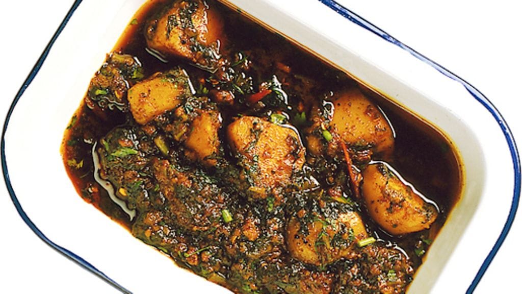 3. Kuumenna öljy paistinpannulla. Pudota öljyyn sinapinsiemen. Kun öljy tirisee, se on sopivan kuumaa. Kuullota sinapinsiemeniä kannen alla noin 10 sekuntia. Sekoita joukkoon pinaatti ja kuullota parin minuutin ajan koko ajan sekoittaen, kunnes pinaatti on kullanruskeaa. Lisää perunat. Jatka kuullottamista kunnes perunat saavat väriä.