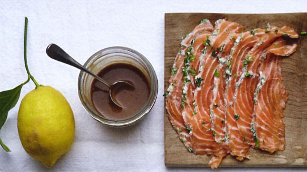 3. Kaada lohesta valunut neste pois. Avaa fileekäärö, huuhtele marinadi pois ja taputtele kuivaksi talouspaperilla. Harjaa ohut kerros piparjuurikermaa sille puolelle, jolta nahka on poistettu, ja laita päälle yrttisilppua. Kääri tiukasti kelmuun ja laita jääkaappiin tarjoamiseen asti.