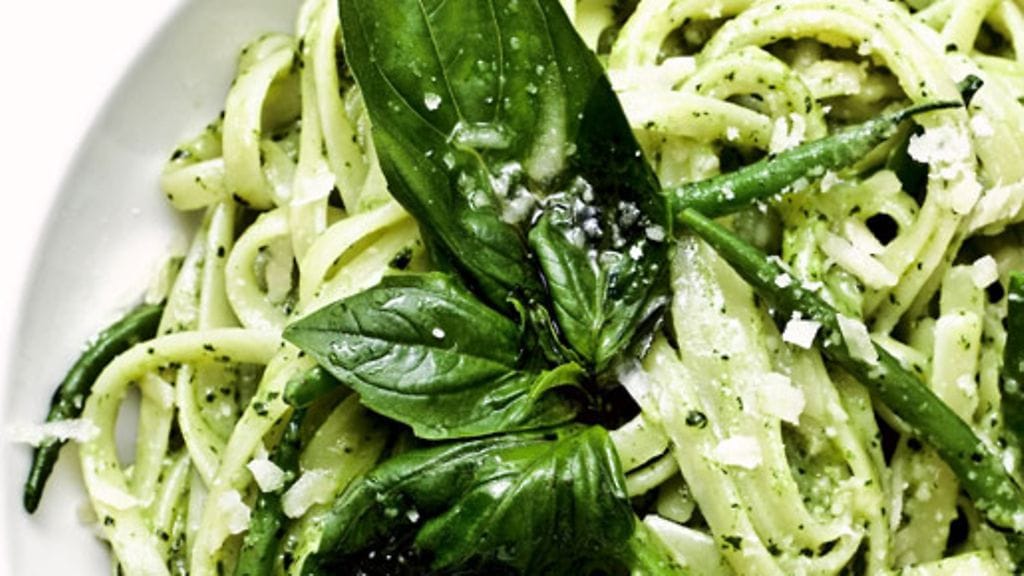 Murskaa valkosipuli, pinjansiemenet, anjovisfileet ja basilika huhmareessa. Lisää öljy ja parmesaani. Laita kylmään.