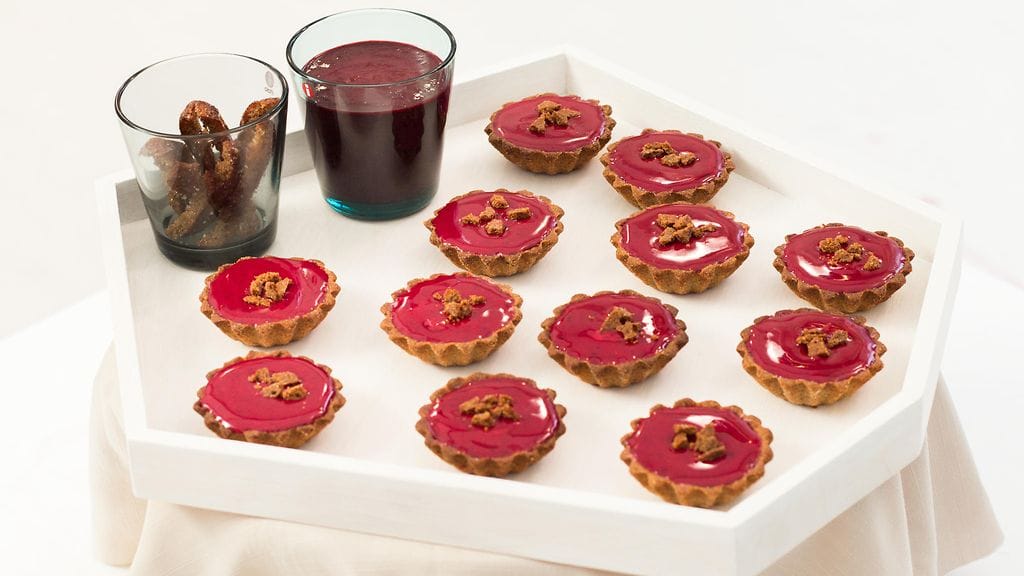 Poista paistoherneet. Anna pohjien jäähtyä hetki. Paina vuoan reunoja kevyesti sisäänpäin, ja irrota pohja varovasti. Jos pohjat tarvitsevat vielä väriä, voit laittaa pohjat vielä hetkeksi uuniin ilman vuokia. Murenna litteä ruiskeksi koristelua varten.