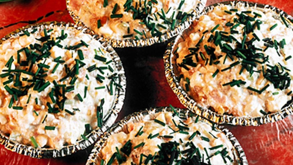 3. Täytä raejuustotahnalla ja ripota pinnalle hiukan lisää ruohosipulisilppua. Pidä kylmässä tarjoiluun.