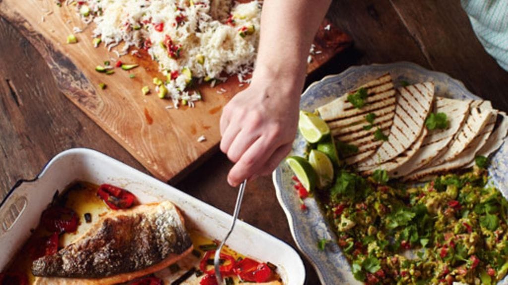 TARJOILU: Vie kala pöytään suoraan uunista ja tarjoile raikkaan kesäkurpitsasalaatin kanssa.