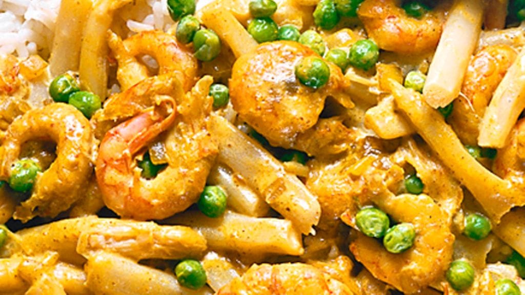 1. Paista sipulia ja valkosipulia matalassa padassa tai teflonpannulla, puuteroi päälle curry ja jauhot. Lisää kerma ja halutessasi parsaliemi, keitä 5 minuuttia.