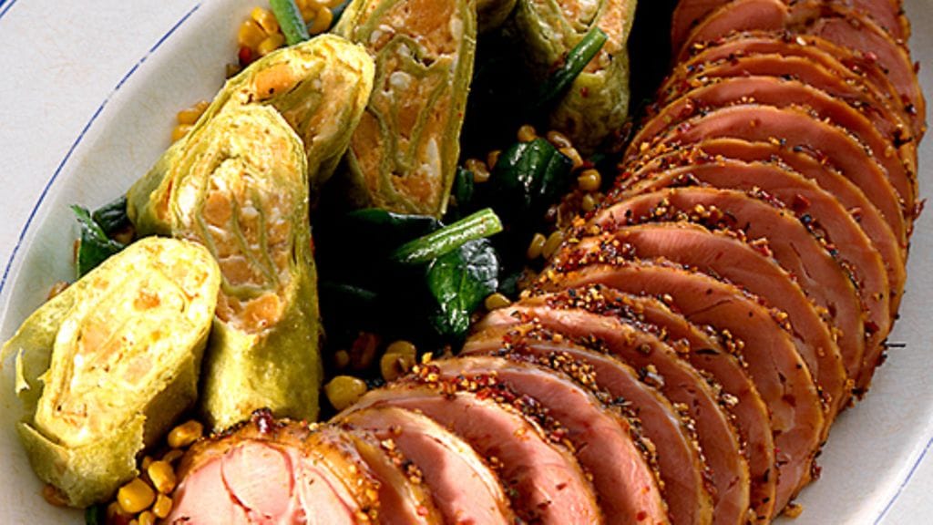 3. Viipaloi paisti, asettele tarjoiluvadille ja koristele rosépippureilla. Tarjoile lisäksi pinaattia, maissinjyviä ja tortillakääröjä.